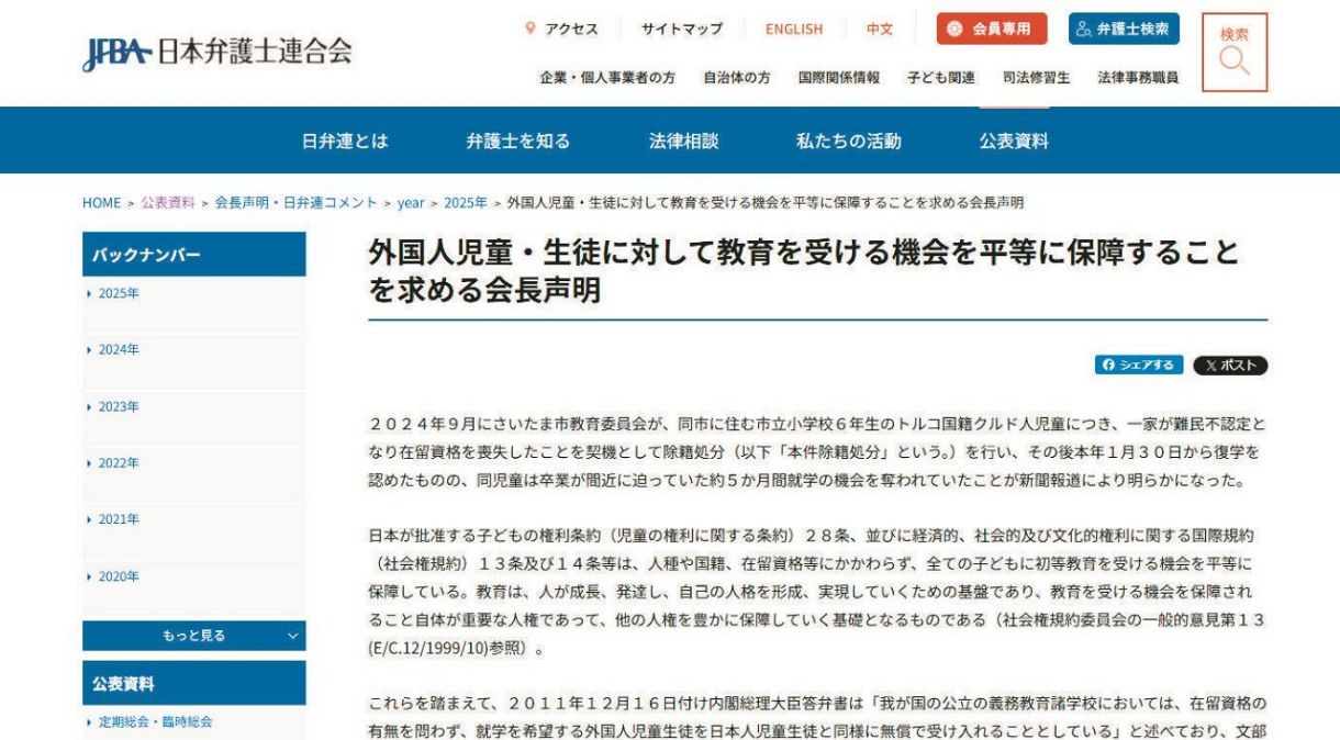 クルド人女児排除問題:日弁連が再発防止策を求める会長声明を公表
